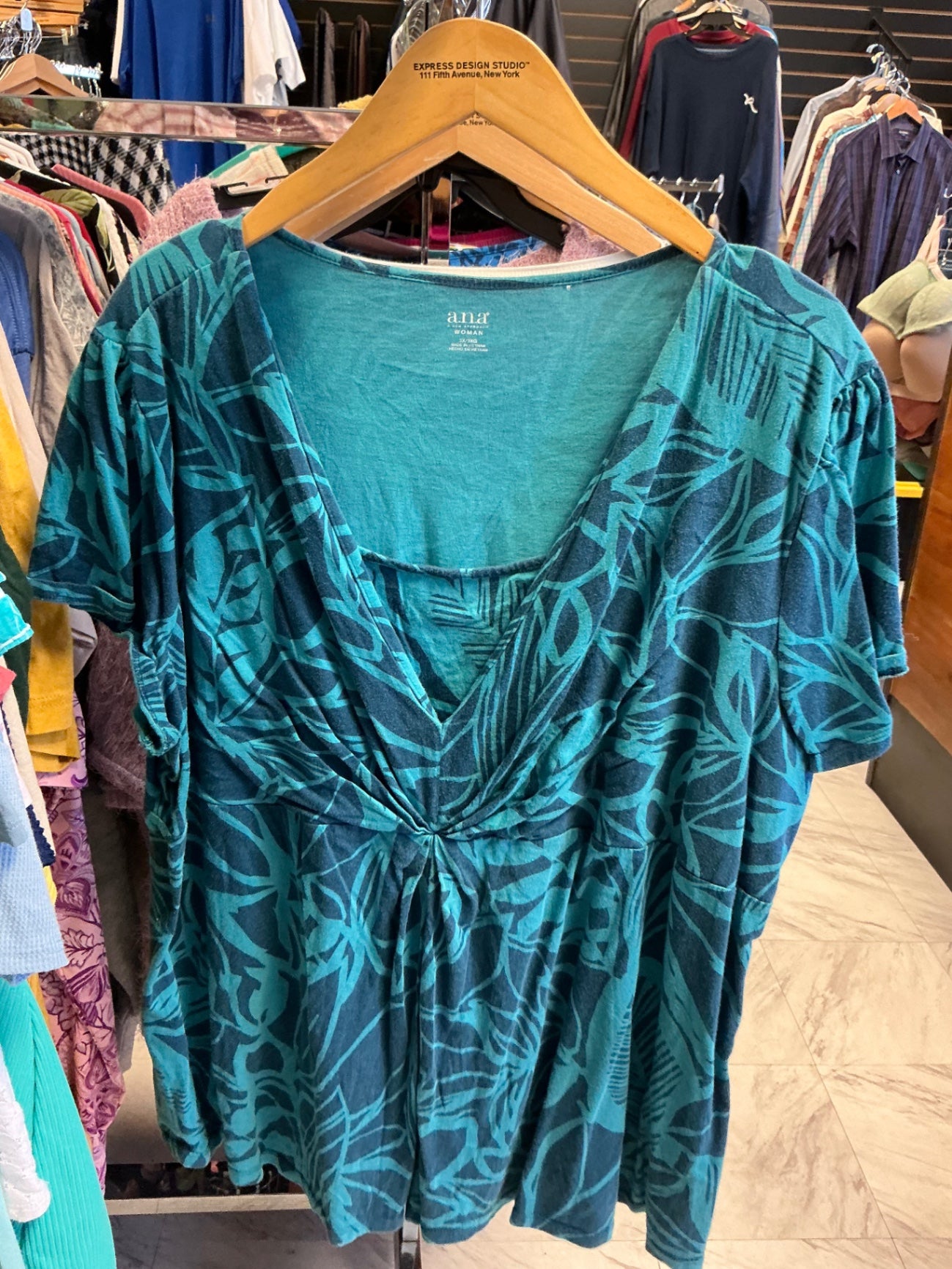 Elevate your wardrobe with this vibrant teal blouse by a.n.a. Crafted from soft cotton, it features a captivating leaf print that's perfect for adding a splash of nature-inspired style to your outfit. The gathered design at the front offers a flattering silhouette, while the short sleeves make it ideal for warmer days. Pair it with your favorite jeans for a casual day out or dress it up with a skirt for a chic evening look. This blouse is both an eye-catching and versatile piece that ensures you're always at your best.